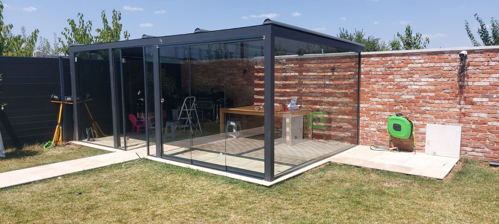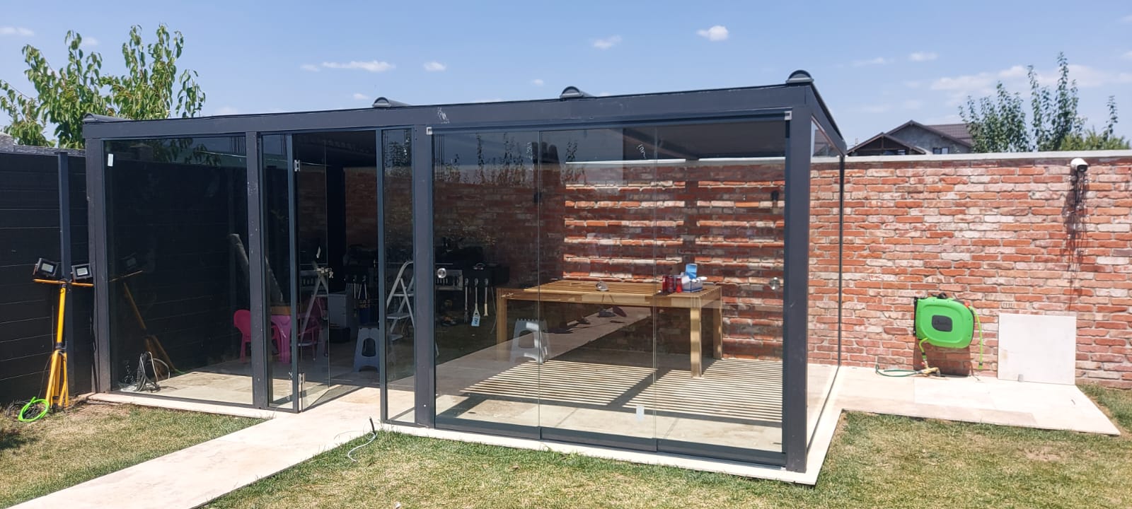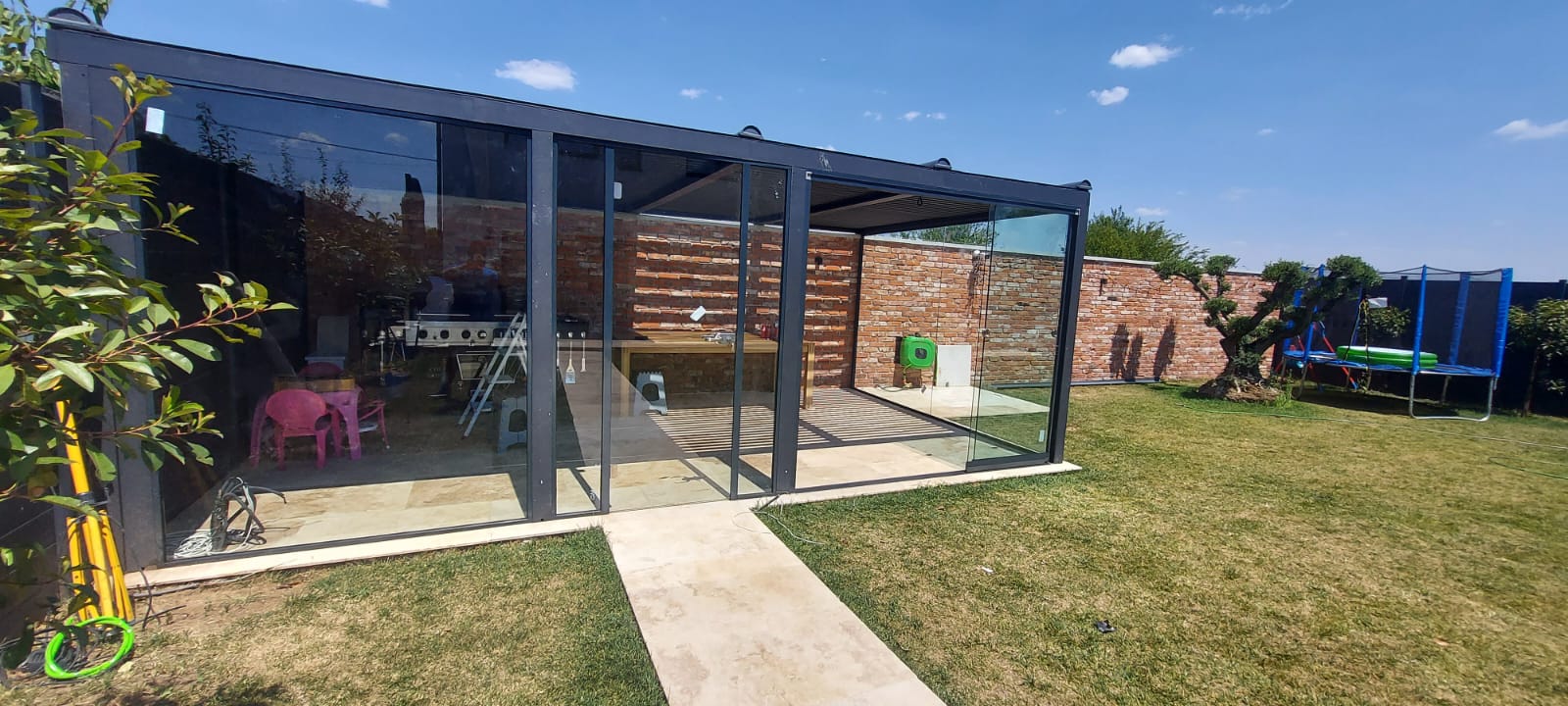 - Posibilitatea de închidere perimetrală, utilizând panouri fixe sau sisteme culisante din sticlă, pentru un plus de confort.
